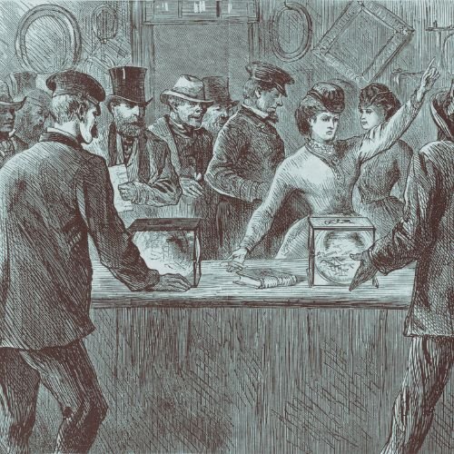 Illustration from the 19th century depicting women participating in civic life during the suffrage movement.